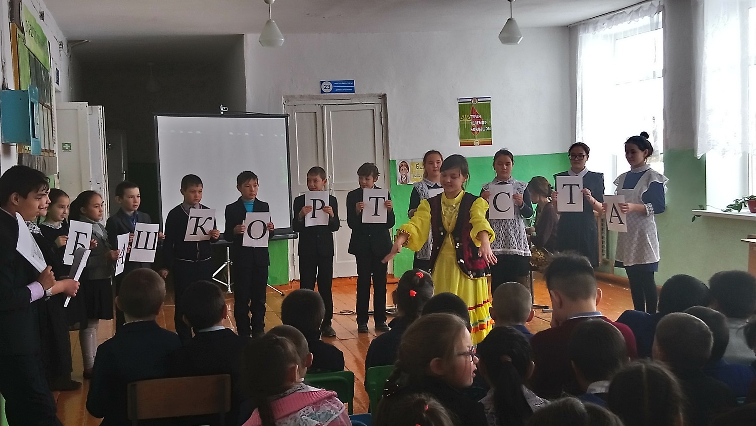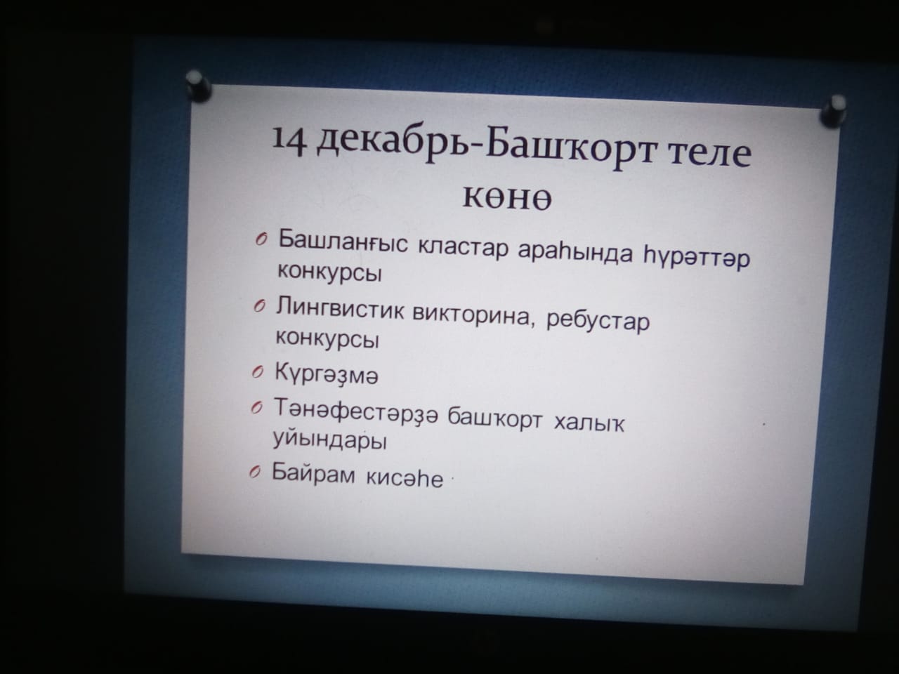 14 декабрь – башҡорт халҡының билдәле мәғрифәтсеһе М.Аҡмулланың тыуған көнө. Был көндө Бөтә донъя башҡорттары Ҡоролтайы башҡарма комитеты Башҡорт теле көнө тип иғлан итте. Беҙҙең мәктәптә лә башҡорт теленә арналған саралар “Мәңге йәшә, башҡорт теле теле” тигән тантаналы линейка менән башланып китеп, 5-9 класс араһында викторина үтте, 1-4 кластар уҡыусылары менән һүрәт төшөрөү менән дауам итте. Тәнәфестәрҙә башланғыс класс уҡыусылары башҡорт халыҡ уйындарын уйнанылар. «Эй илһамлы, башҡорт теле» исемле байрам кисәһе уҙғарылды. Унда 5-9-сы класс уҡыусылары күренекле шағирҙарыбыҙҙың туған телебеҙгә арнап яҙған шиғырҙарын һөйләнеләр, тел тураһында йырҙар яңғыраны. Сараға хаҡлы ялда булған уҡытыусыларыбыҙҙың килеүе байрамға йәм өҫтәне. Шағир-мәғрифәтсе М.Аҡмулланың тормош һәм ижад юлы менән таныштылар. Ағинәйҙәр менән бер рәттә “Исем ҡүшыу” йолаһы күрһәтелде. Байрам Флешмоб менән тамамланды.