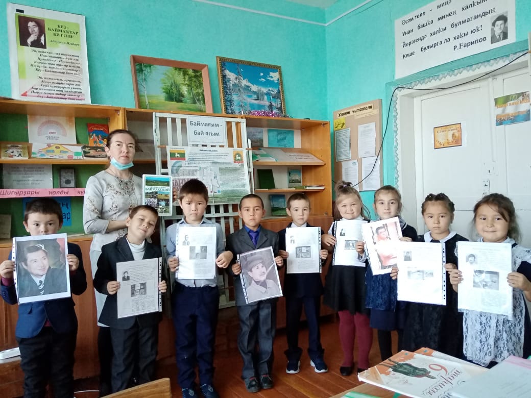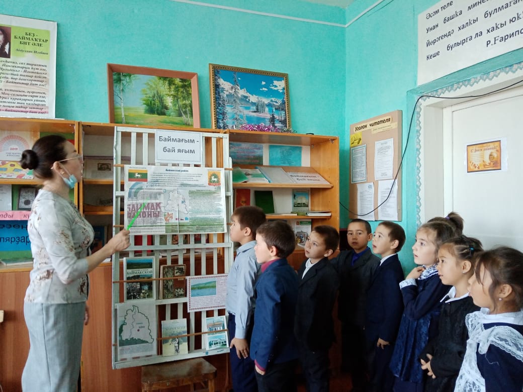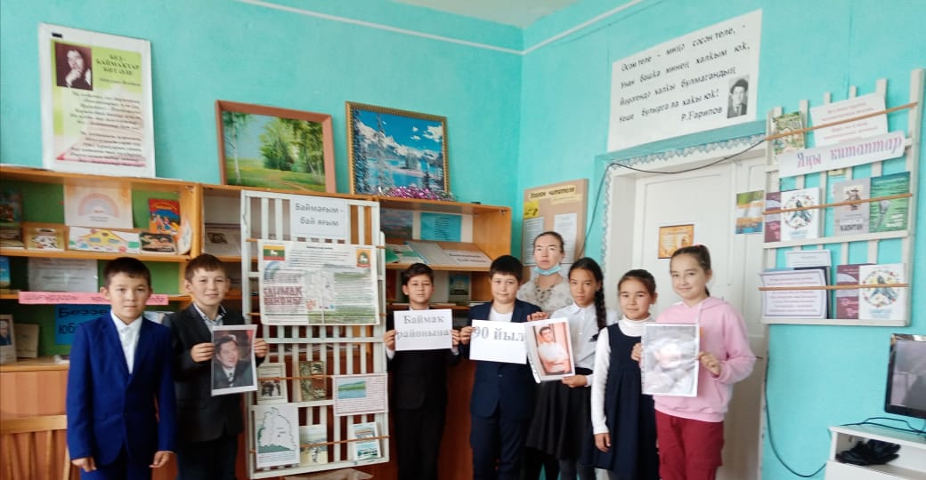 Башҡортостан Республикаһы көнөнә Һәм Баймаҡ районының ойошторолоуына 90 йыллығына арналған китапханала күргәҙмә ойошторолдо һәм "Баймағым-бай яғым", "Баймаҡ -таланттарға бай яҡ" исемле дәрес-әңгәмә үтте.Гөлфиә Нотфулла ҡыҙы районыбыҙҙың, ауылыбыҙҙың арҙаҡлы шәхестәре тураһында һөйләне.