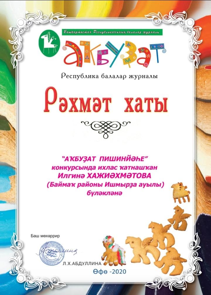 Ишмырҙа ауылы төп дөйөм белем биреү мәктәбенең IV класс уҡыусыһы Хажиәхмәтова Илгинә "Аҡбуҙат" журналы ойошторған "Аҡбуҙат пишинйәһе" бәйгеһендә ҡатнашҡаны өсөн Рәхмәт хаты менән бүләкләнде. Һаулыҡ, уҡыуында ҙур уңыштар, яңы үрҙәр теләйбеҙ.