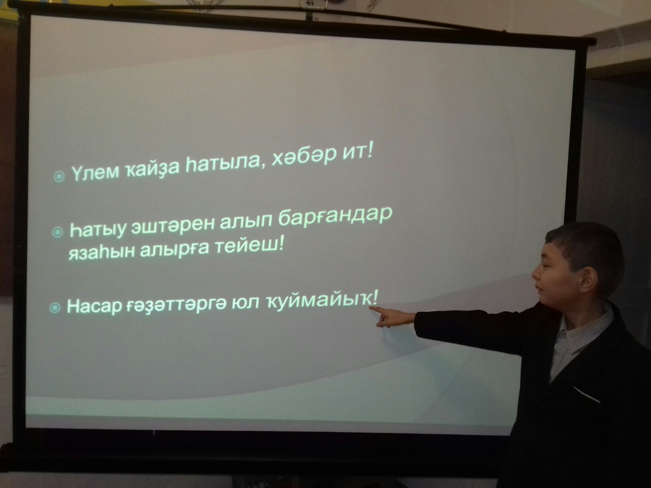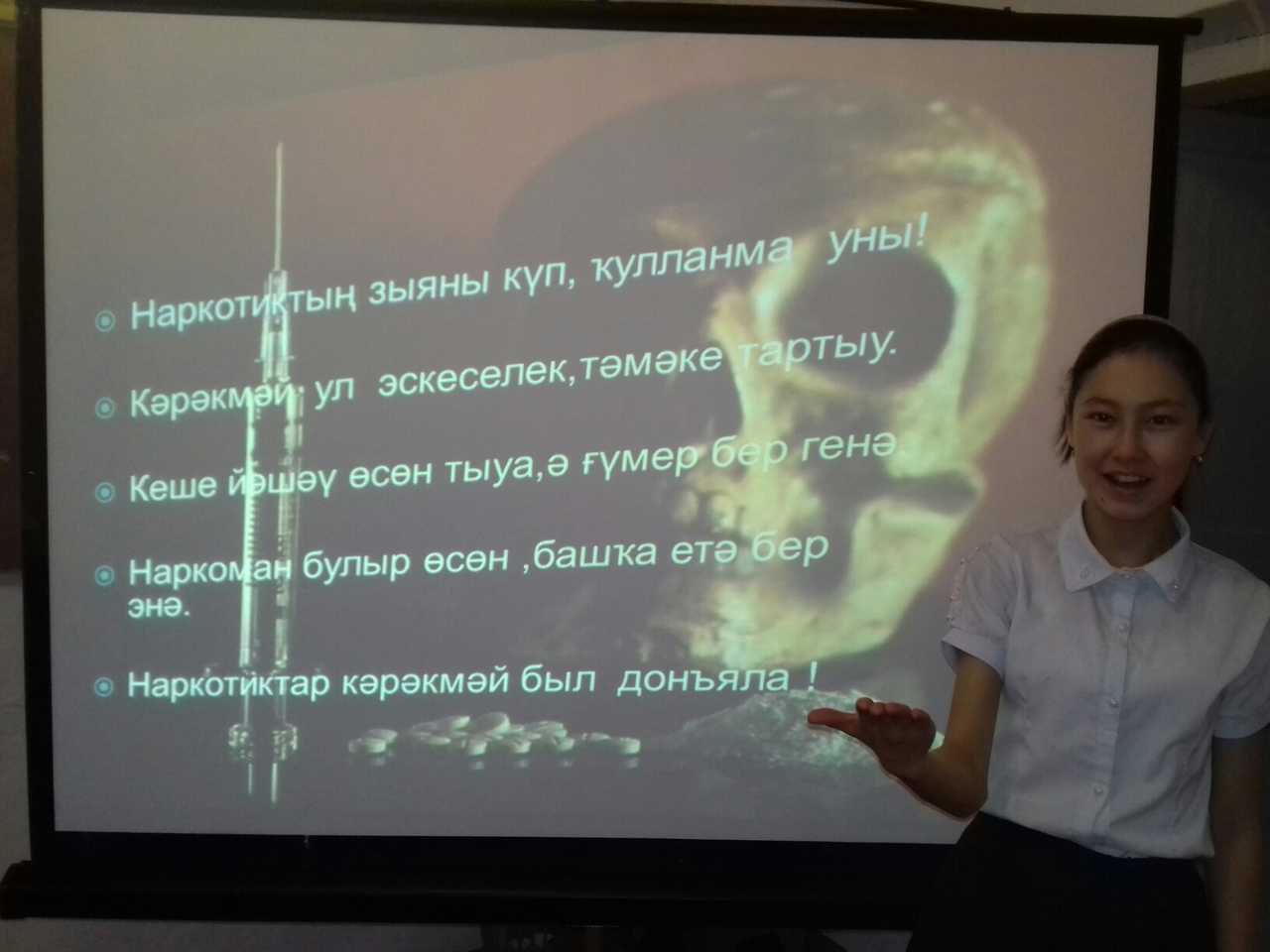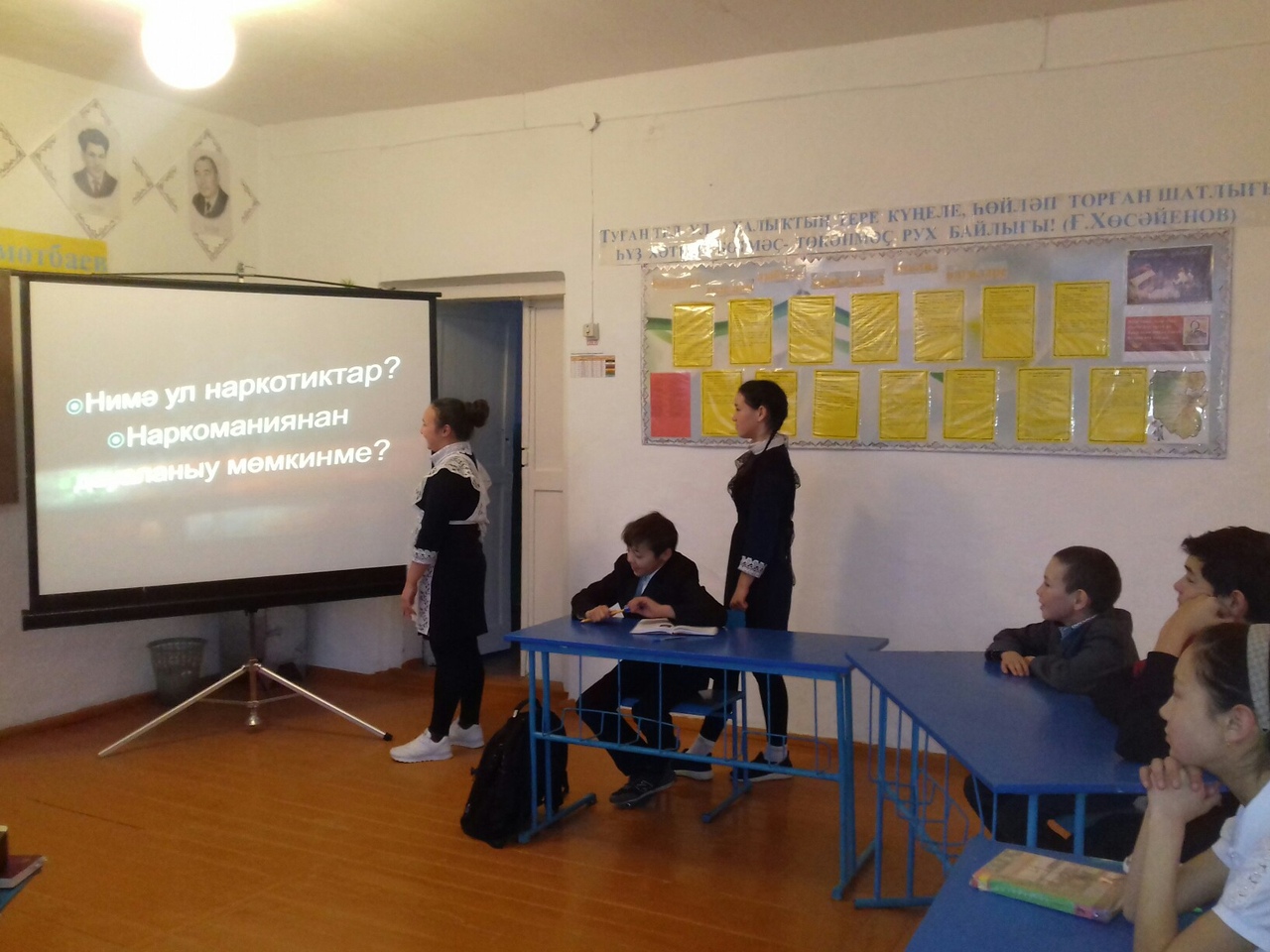 Класс етәксеһе Хажиәхмәтова Г.Н. “Тәмәке, наркотик һәм баласаҡ” исеме аҫтында класс сәғәте үткәрҙе. Наркотиктарҙың сәләмәтлек өсөн зарарлы икәнен төшөндөрҙө, тәмәкенең зарарлы булыуын аңлатып үтте, аңлы рәүештә уларҙы ҡулланмаҫҡа өйрәтте һәм балаларҙа сәләмәтлек тойғоһо тәрбиәләне.