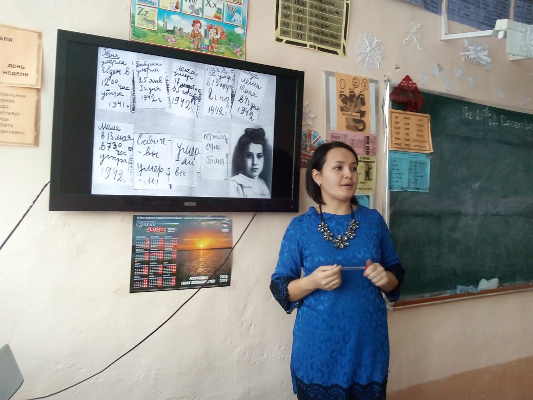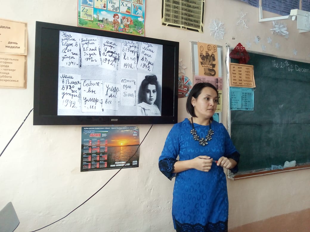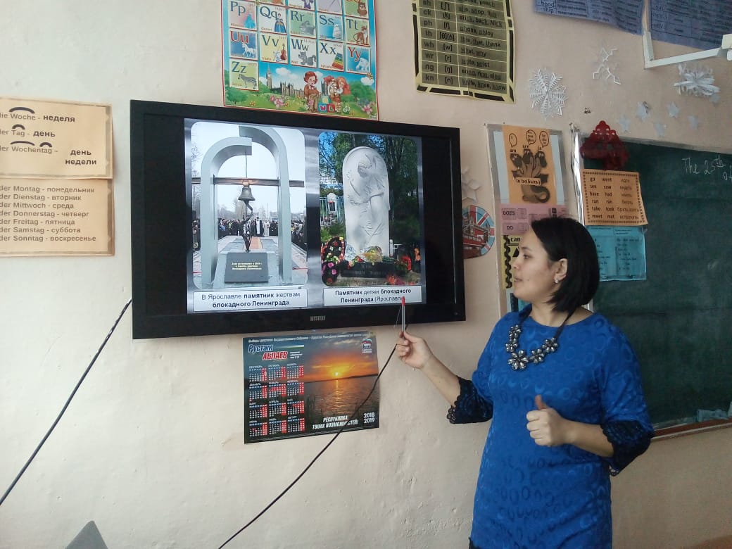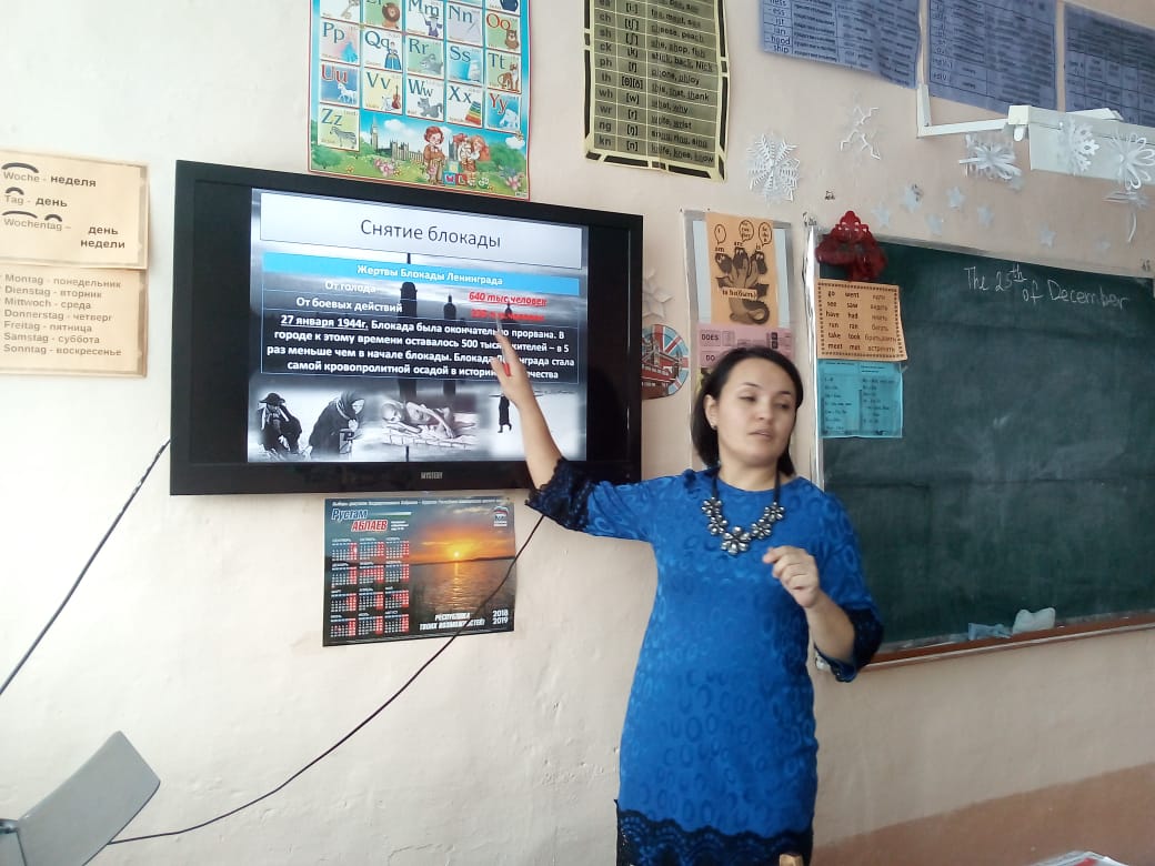 25 декабря на базе нашей школы среди 6-9 классов прошел единый урок - памяти, посвященный к 75-летию освобождения блокады Ленинграда. Цель - сохранение памяти о подвиге нашего народа во время Великой Отечественной войны 1941-1945 г.г., пробудить в детях чувство сострадания и гордости за стойкость своего народа в период блокады Ленинграда и на протяжении всей Великой Отечественной войны. Основные задачи развивать интерес к истории своей страны, воспитывать чувство уважения у старшему поколению.