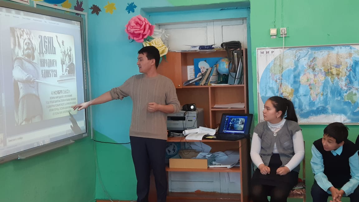 На классном часе Ильясов И.А. – учитель истории рассказал, что праздник единения России установлен в память о событиях 4 ноября 1612 года, когда воины народного ополчения под предводительством Кузьмы Минина и Дмитрия Пожарского штурмом взяли Китай-город, освободив Москву от польских интервентов и продемонстрировав образец героизма и сплочённости всего народа вне зависимости от происхождения, вероисповедания и положения в обществе.