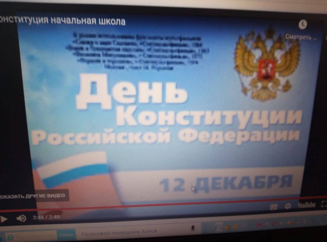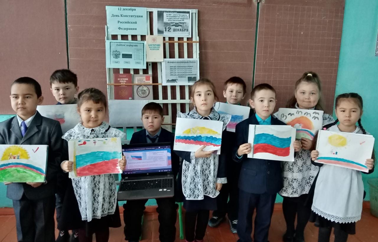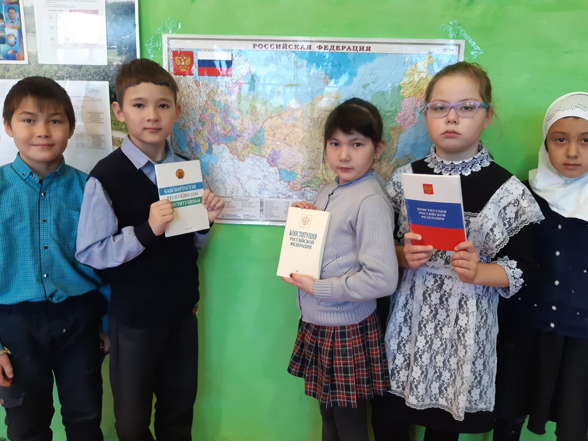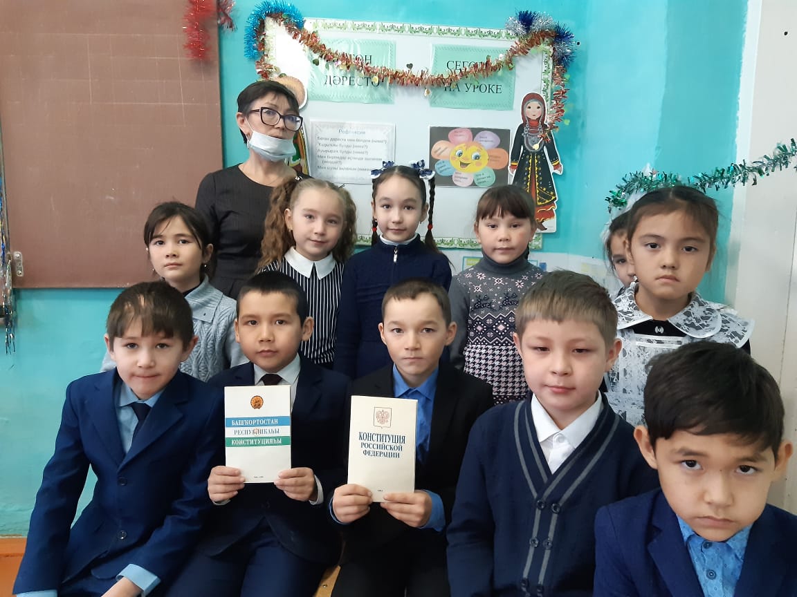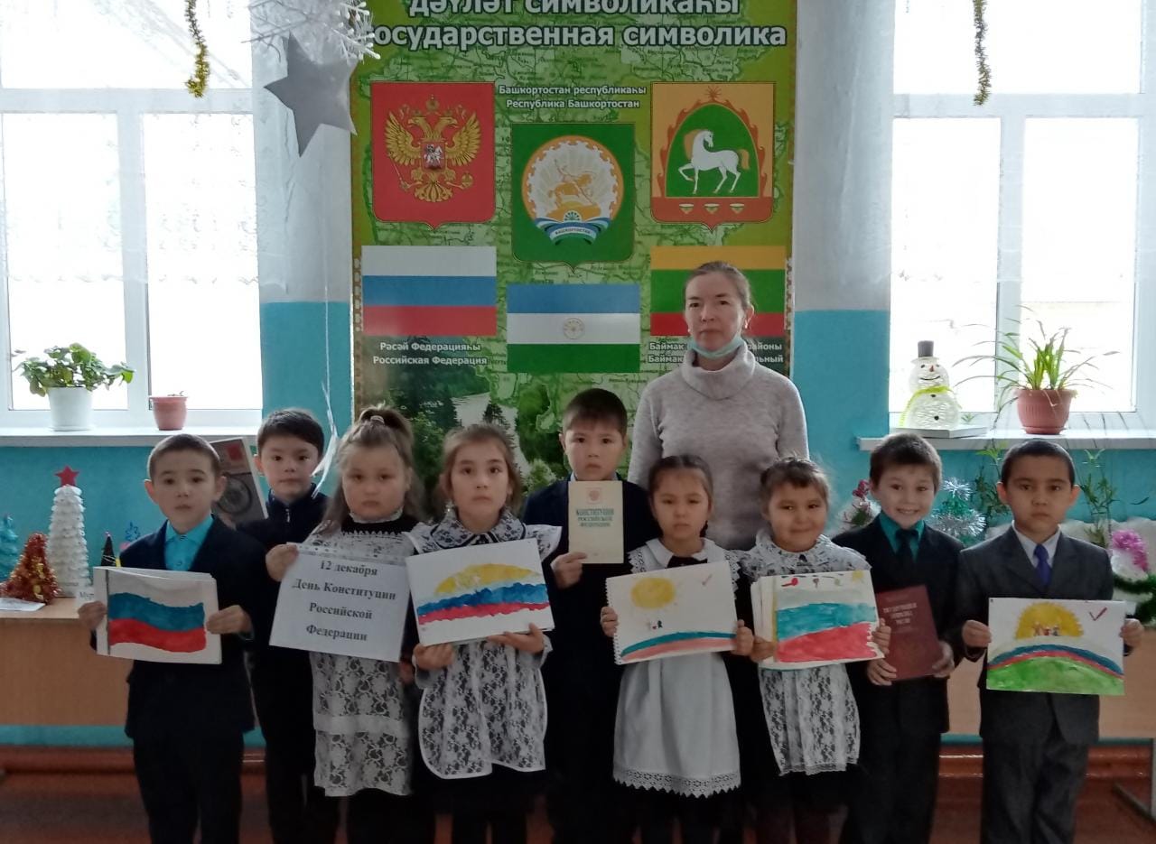 Рәсәй Федерацияһының Конституция көнөнә арнап, башланғыс кластарҙа тематик класс сәғәттәре үтте."Дәүләт символдары", темаһына һүрәттәр эшләнеләр, конституция тураһында презентациялар ҡарап, һорауҙарға яуап бирҙеләр. I класс уҡыусылары"Азбука прав"мультфильмын ҡаранылар. Уҡыусылар төрлө һорауҙарға яуап бирҙеләр.