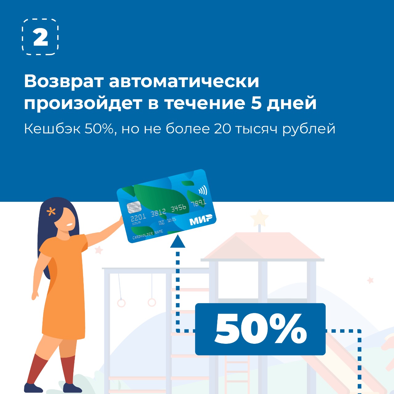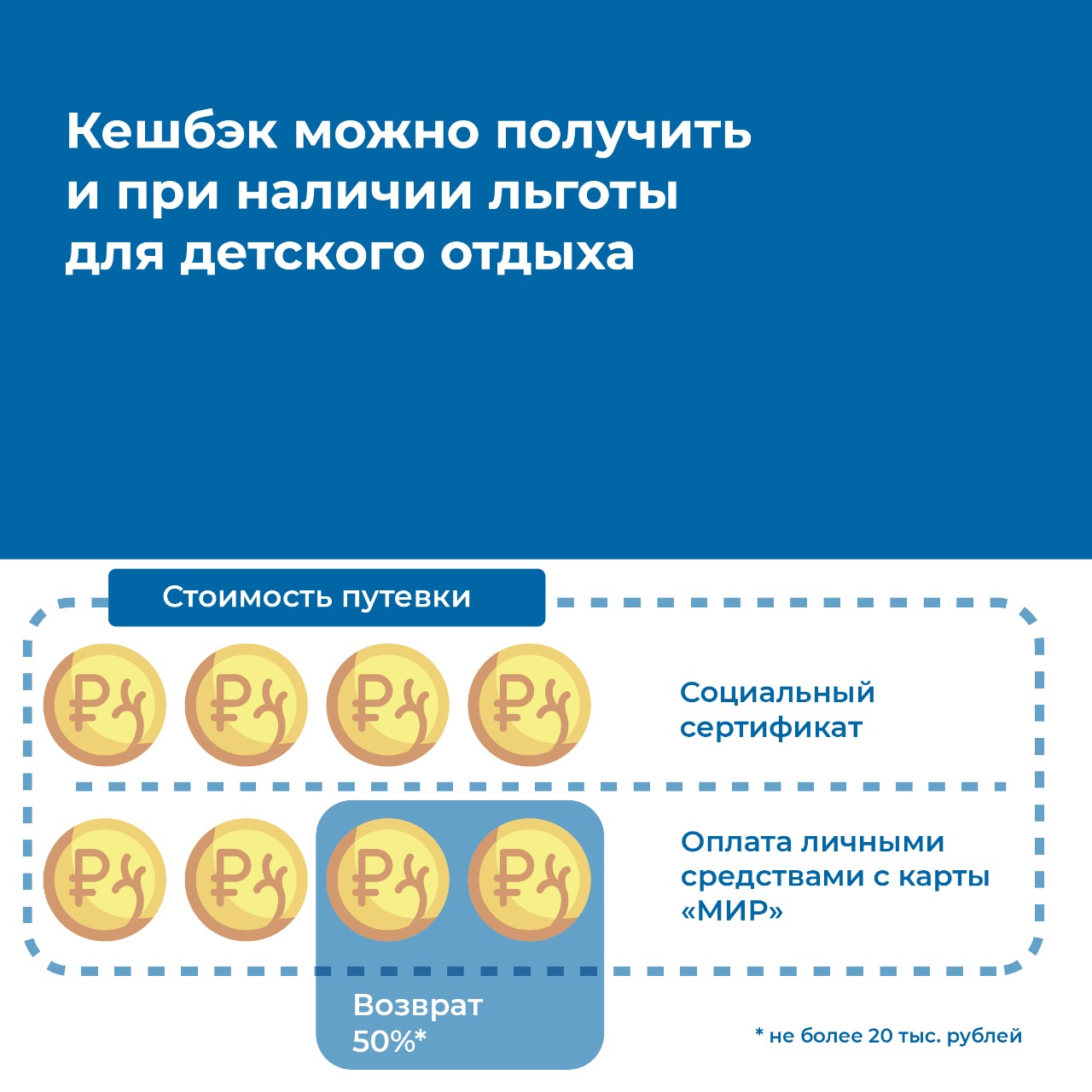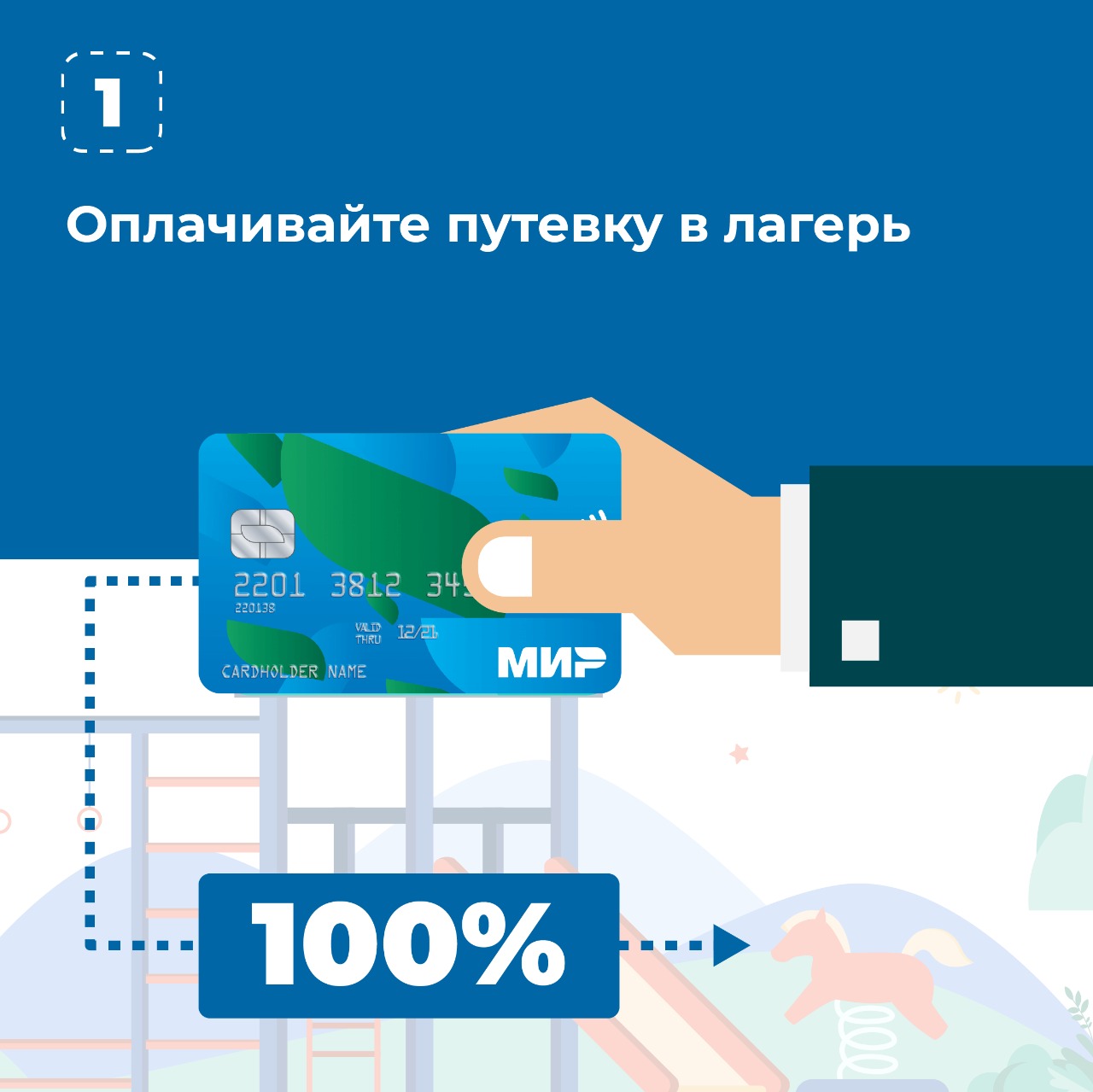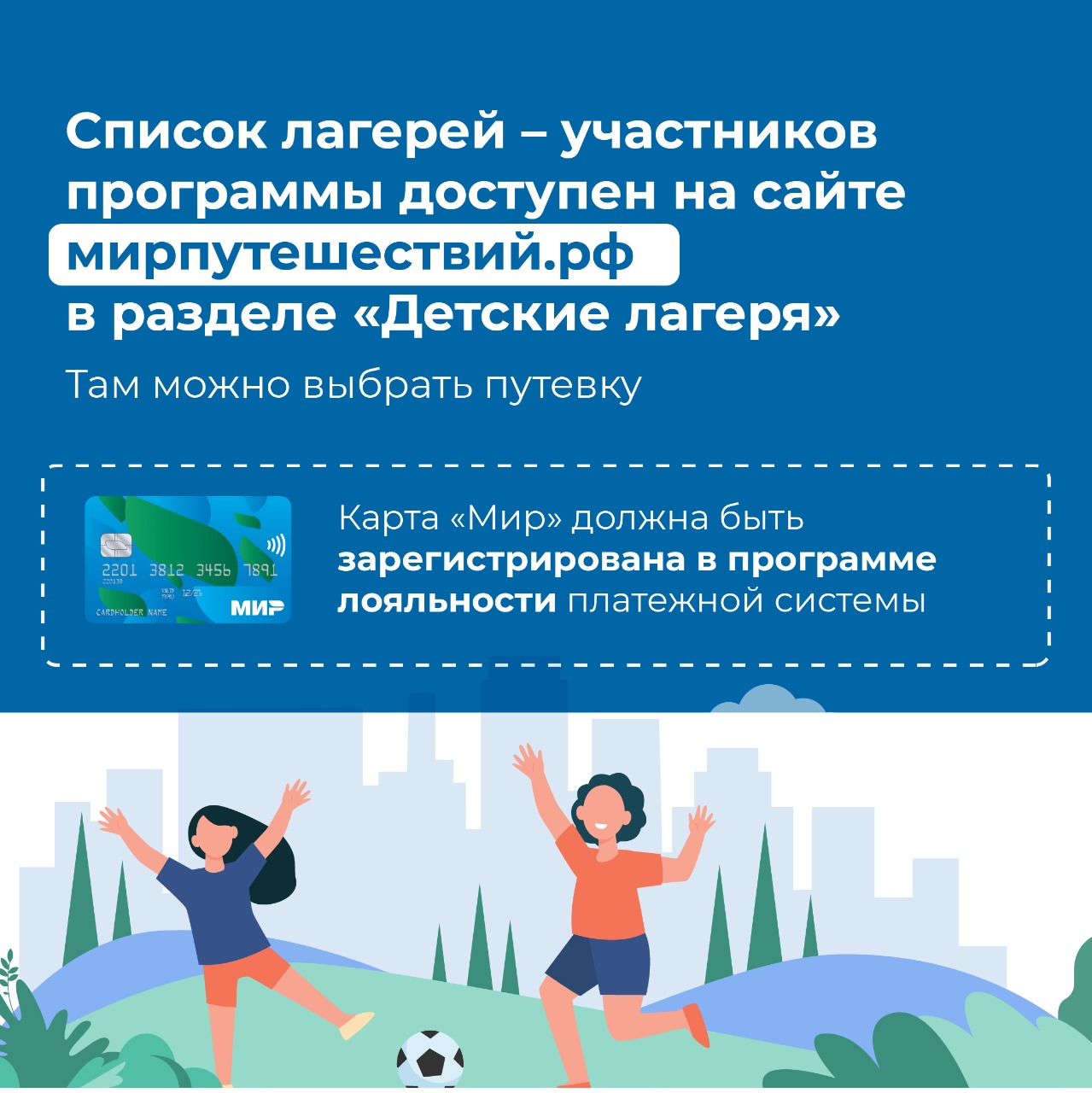 Получите до 50% от стоимости путёвки в стационарный детский лагерь с круглосуточным проживанием на карту «Мир», которой вы оплатите путевку онлайн.